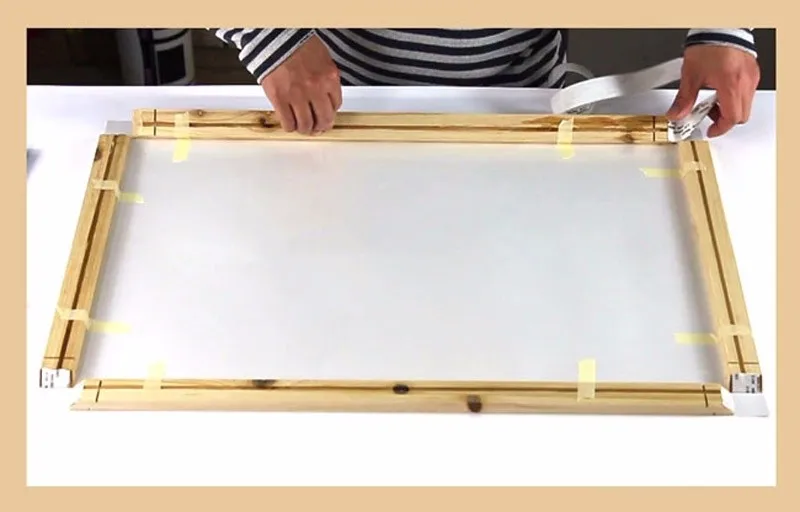 please rip off the double adhesive tape one by one; then erected the wood make sure the painting angle clamped between the wood angle. press the wood to be more fixed.