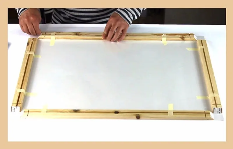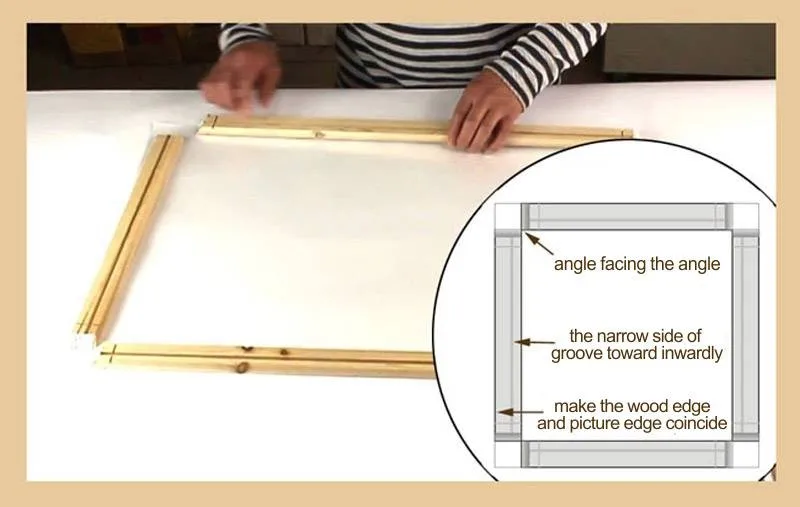 Overturn the painting, and use the pen mark the wood position on the painting. please make sure the wood angle facing the angle and then the narrow side of groove toward inwardly. make sure the wood edge and the painting edge coincide each other, this is very important.